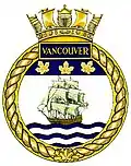 The ship's badge depicts a square-rigged, Royal Navy ship of the line sailing west along the ocean. The vessel in the badge is intended to represent HMS Discovery, which, under the command of Captain George Vancouver, mapped much of North America's north-western coast and learned more about the area than had hereto been discovered. Among the geographical locations named after Vancouver is the city of Vancouver, British Columbia. The badge has been maintained through the history of all three Canadian vessels named Vancouver.