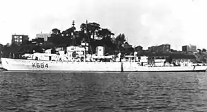 The River-class frigate was designed by William Reed of Smith's Dock Company of South Bank-on-Tees. Originally called a "twin-screw corvette", its purpose was to improve on the convoy escort classes in service with the Royal Navy at the time, including the Flower-class corvette. The first orders were placed by the Royal Navy in 1940 and the vessels were named for rivers in the United Kingdom, giving name to the class. In Canada they were named for towns and cities though they kept the same designation.[5] The name "frigate" was suggested by Vice-Admiral Percy Nelles of the Royal Canadian Navy and was adopted later that year.[6]
