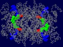 HMG-CoA reductase-Substrate complex (Blue:Coenzyme A, red:HMG, green:NADP)