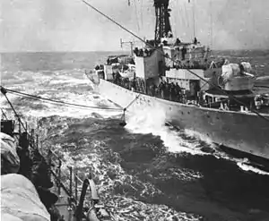 On 17 July 1951 during a patrol in the approaches of Chinnampo harbour she carried out an attack on an enemy gun position at Sogon-Ni Point. An assault party of 14 men, supported by gunfire from the ship, landed and took two enemy soldiers prisoner.[2] On 25 August she carried out second raid on gun positions at Sogon-Ni. The shore party, which included Royal Marines from HMS Ceylon landed, but came under fire and 19-year-old Able Seaman Robert Edward Marchioni was killed. He was the only RNZN casualty of the Korean War. Patrol and support bombardment duties off west coast of Korea continued into September and Rotoiti completed her first tour of duty with the United Nations in October.