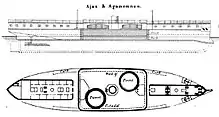 The Ajax class was designed as a shallow-draught version of the preceding Inflexible that was also smaller and cheaper; unfortunately the need, imposed by budgetary constraints, to produce a smaller ship produced a vessel with all of the shortcomings of Inflexible but with none of her virtues.[1] The ships had a length between perpendiculars of 280 feet (85.3 m) and were 300 feet 9 inches (91.7 m) long overall, some 44 feet (13.4 m) shorter than Inflexible. They had a beam of 66 feet (20.1 m), and a draught of 23 feet 6 inches (7.2 m) and displaced 8,510 long tons (8,650 t). Their crew consisted of 345 officers and ratings, over 3,000 long tons (3,048 t) less than Inflexible. The Ajax-class ships were bad seaboats and steered very erratically, especially at high speed. More deadwood was added to their sterns in 1886 in a partially successful attempt to rectify the problem.[2]