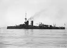 A fire-control director was installed on the roof of the spotting top shortly after completion in 1913; her original pole foremast was reinforced by short tripod legs to stiffen it and allow it to bear the weight of the director.[6] By October 1914, a pair of 3-inch (76 mm) anti-aircraft (AA) guns had been added.[7] Approximately 80 long tons (81 t) of additional deck armour was added after the Battle of Jutland. By April 1917, the 4-inch guns had been removed from the hull casemates as they were frequently unusable in heavy seas. The casemates were plated over and some of the compartments were used for accommodations. Her stern torpedo tube was removed in 1917–1918 and a flying-off platform was fitted on the roof of 'B' turret during 1918.[8]