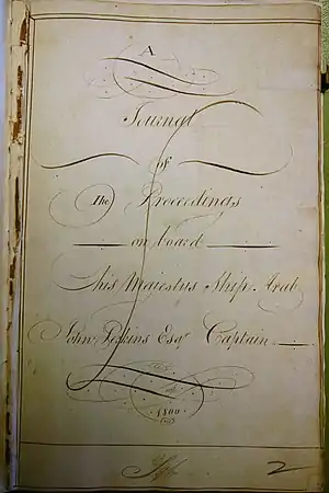 On 5 January 1799 Captain Thomas Bladen Capel took command of Arab, sailing for Jamaica on 23 April.[2] After arriving in the West Indies, at about midnight on 10 July, she engaged three Spanish frigates off the coast of Havana for about half an hour, losing three of the crew to enemy fire though apparently giving as good as she got thus causing the Spanish to withdraw. It was also during late June and early July 1799 that there was a serious outbreak of yellow fever on board, something from which ten of the Ship's company would die, including its carpenter Jeremiah Driscoll. The journal of the ship's surgeon, Thomas Tappen, contains an interesting and detailed account of the symptoms these men experienced, together with his treatment for the fever, including the use of bloodletting and the administering of calomel.[11][12]