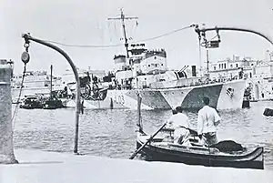Badsworth was thence deployed in the Western Mediterranean for convoy defence and patrol. On 22 April, she was mined at Bône, Algeria, sustaining major structural damage in her aft section. Badsworth’s starboard engine was immobilised, with both shafts distorted. The ship was beached, and had to be refloated and towed back into harbour by the minesweeper Clacton. Temporary repairs were made in Malta during May, upon completion Badsworth was towed back to the United Kingdom by the tug Frisky as part of Convoy MKS-15. The destroyer was taken in hand for extensive repairs at a commercial shipyard in Liverpool in July. The destroyer was paid off from Royal Navy service and transferred on loan to the Royal Norwegian Navy on 8 August 1944. Badsworth was renamed as HNoMS Arendal. The ship was decommissioned from the Royal Navy on 16 November 1944.[18]