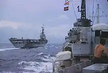 During April she sailed for the Mediterranean to continue flying exercises with her new air-group and met Hermes for the first time at Gibraltar. Although she was originally scheduled to cross the North Atlantic for a visit to the US and Canada, events in the Middle East were to lead to a rapid change of plans.[40]