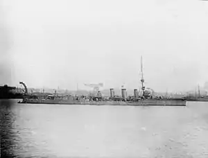 In January 1917, Cleopatra participated in an unsuccessful operation to attack German destroyers off the Belgian coast.[3] She underwent modernisation during 1917,[2] and in October 1917 joined the other Harwich Force cruisers in a patrol zone to intercept any German attempt to intercept convoys steaming to and from Scandinavia.[3] She was assigned to the 7th Light Cruiser Squadron of the Grand Fleet in August 1918 as squadron flagship, and served in that capacity through the end of World War I in November 1918 and until March 1919.[2]