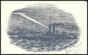 ![]() A 1915 postcard drawing of HMS Cricket and a Zeppelin airship | |