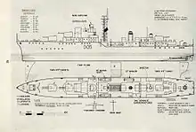 Armament originally consisted of six 4.5 inch guns, six 40 mm AA guns, ten 21 inch (533 mm) torpedo tubes (five of which were removed in 1958 – 1959) and one Squid triple-barrelled depth-charge mortar. Power was provided by Parsons steam turbines giving 54,000 shp (40 MW) and a maximum sea speed of 30.5 knots (56.5 km/h). Electrical supplies were from two steam turbo-generators, each capable of supplying 350 kilowatts (470 hp) at 220 volts DC, and two diesel generators, each capable of 150 kilowatts (200 hp).[2]