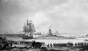 In the spring of 1807 she and her sisters were ordered to the Baltic where their characteristics would be of value as convoy escorts and particularly in support of operations ashore. On 13 May Dauntless was ordered to sail up the Vistula and break through the French armies besieging Danzig (now Gdansk) in order to supply the encircled Prussians with 600 barrels of gunpowder. Heavily laden and making upriver under a press of sail, Dauntless became unmanageable and broached to. Running hard aground on a sandbank within easy range of French artillery, she suffered an hour's bombardment before surrendering. Napoleon himself is reputed to have said that her resistance "was worthy of being placed on the page of history".[5] Strachey then remained a French prisoner until the end of the war.[5] At the obligatory court martial her captain, Christopher Strachey, was honourably acquitted of all blame for the surrender of his ship.