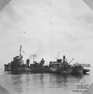 Near the mouth of the Argolic Gulf a Staffel of nine Luftwaffe Junkers Ju 87 Stuka dive-bombers from Sturzkampfgeschwader 77 attacked the convoy at either 06:45 or 07:15. Slamat was hit, set afire and began to abandon ship. Calcutta ordered Diamond to go alongside Slamat to rescue survivors while the rest of the convoy continued to try to reach Souda Bay in Crete.[11] At 08:15 Diamond reported that she was still rescuing survivors and still under air attack. By then three destroyers had reinforced the convoy so Calcutta sent one of them, HMS Wryneck, to assist Diamond. Slamat was afire from stem to stern when Diamond fired a torpedo that sank her in a coup de grâce.[12] Diamond reported at 09:25 that she had rescued most of the survivors and was proceeding to Souda Bay. An hour later Wryneck signalled a request for aircraft cover.[11]