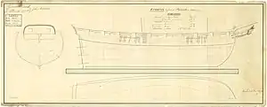 ![]() Plan showing the body plan with stern board outline, some decoration detail and sheer lines with inboard detail. | |