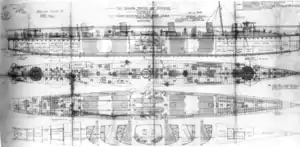 Express was 239 feet 6 inches (73.00 m) long overall, with a beam of 23 feet 6 inches (7.16 m) and a draught of 14 feet 8 inches (4.47 m). Displacement was 465 long tons (472 t) light and 540 long tons (550 t) full load. Four coal-fired Normand boilers fed steam at 240 pounds per square inch (1,700 kPa) to two triple expansion engines rated at 9,250 indicated horsepower (6,900 kW).[3] Four evenly spaced funnels were fitted.[4] Up to 140 long tons (140 t) of coal were carried, sufficient to give an endurance of 1,470 nautical miles (2,720 km; 1,690 mi) at 11 knots (20 km/h; 13 mph).[5]