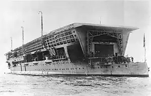 The ship's superstructure, masts, funnel and landing deck were removed and she was given a 576-by-92-foot (175.6 by 28.0 m) flight deck that extended over three-quarters of her length. This flight deck was not level; it sloped upwards about three-quarters of the way from the stern to help slow down landing aircraft, which had no brakes at that time. The fore-and-aft 320-foot (97.5 m) arresting gear was not intended to stop landing aircraft—the landing speeds of the time were low enough that this was unnecessary given a good headwind—but rather to prevent aircraft from veering off to one side and potentially falling off the flight deck.[21] Various designs for the flight deck were tested in a wind tunnel by the National Physical Laboratory which showed that the distinctive elliptical shape and rounded edges used minimised turbulence.[22]