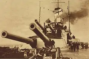 On 24 April 1918, Hercules were ordered north to Orkney to support the dreadnought Agincourt and the 2nd Cruiser Squadron when the High Seas Fleet sortied north for the last time to intercept a convoy to Norway.[26] They enforced strict wireless silence during the operation, which prevented Room 40 cryptanalysts from warning the new commander of the Grand Fleet, Admiral Beatty. The British only learned of the operation after an accident aboard the battlecruiser SMS Moltke forced her to break radio silence to inform the German commander of her condition. The British ships were not able to reach the High Seas Fleet before it turned back for Germany.[27] The ship was present at Rosyth, Scotland, when the German fleet surrendered on 21 November. On 3 December, she was detached to take the Allied Naval Armistice Commission to Kiel, Germany, returning to Rosyth on 20 December. Hercules was reduced to reserve in February 1919 at Rosyth and listed for disposal in October 1921. On 8 November, she was sold to the Slough Trading Co. and was resold to a German company in September 1922. The ship departed Rosyth, under tow, for Kiel in October and was subsequently broken up.[13]