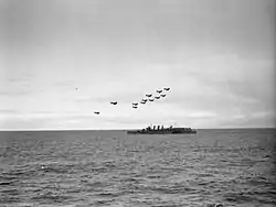 On 17 July 1944, the ship was formed part of the covering force protecting three British aircraft carriers flying off aircraft to attack the German battleship Tirpitz during Operation Mascot. Kent escorted three aircraft carriers that attacked the German airfield at Kristiansand on 10 August. She escorted two carriers on 12 September while their aircraft attacked German shipping near Stadlandet. On the night of 13/14 November 1944, as flagship of Rear-Admiral Rhoderick McGrigor during Operation Counterblast, the ship, with the light cruiser Bellona and four destroyers, attacked Convoy KS.357 off Listerfjord, south-east of Egersund, Norway. The convoy consisted of four freighters escorted by the minesweepers M.416, M.427 and four submarine chasers. Opening fire at 2300 hrs, the cruisers and destroyers sank two of the freighters and all the escorts above except one unidentified vessel.[18]