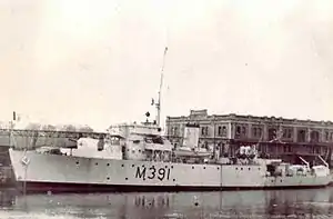The ship was ordered on 30 April 1942 at the Harland & Wolff at Belfast, Ireland. She was laid down on 27 November 1943 and launched on 22 August 1944. She was commissioned on 18 January 1945.[3] She joined the 10th Minesweeper Flotilla.[4]