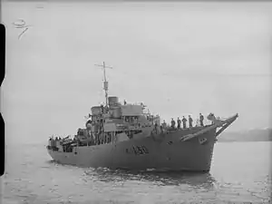 Lotus commissioned in May 1942, and was assigned to escort duty on the Arctic convoy route. In June she sailed with the ill-fated Convoy PQ 17. After the convoy scattered, Lotus accompanied Pozarica and several other ships to Novaya Zemlya, before setting out on her captain's initiative to search for survivors. She was able to rescue 38 men from SS River Afton, including Jack Dowding, the convoy commodore, and 29 from the US-American SS Pan Kraft, that had been disabled by German bombers.[1] Returning to Matochkin, Lotus and her companions escorted the eight ships there to Archangel, arriving on 11 July, although two were sunk by aircraft before reaching port. From Archangel, and with two other ships under the leadership of Comm. Dowling, Lotus helped to find and escort six more ships in the White Sea, and brought them to Archangel.[2] She returned to Britain in September 1942 with Convoy QP 14.