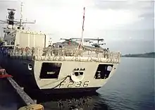In 2014, Montrose was tasked to join Norwegian and Danish warships in Operation RECSYR – the mission to escort the merchant vessels removing the Syrian chemical weapons stockpile for destruction.[20] Having handed over to HMS Diamond, the ship arrived home in March 2014.[21] Subsequently, and after a high-profile London visit to celebrate 20 years since the ship's commissioning,[22] the ship was sent to the Baltic Sea to participate in BALTOPS 14, a large scale US-led multinational exercise with participation from 30 ships and submarines from 14 nations.[23]
