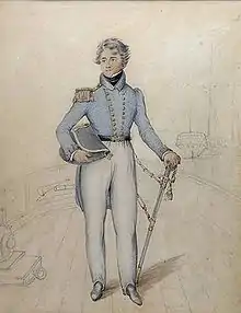 Captain the Honorable Robert Cavendish Spencer took command of Owen Glendower in August 1819.[6] He brought with him nearly all the officers and 18 young gentlemen from his previous command, Ganymede. Owen Glendower was nominally ready for sea, but Spencer found the reality less compelling. He therefore spent two and a half months re-rigging and re-fitting.[lower-alpha 2] He also discharged about a fifth of his crew and lost about the same proportion to sickness and desertion.[17]