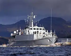 After a 300-pound (140-kilogram) mine was dredged up by a fishing boat in 2014, Pembroke detonated the mine using a Seafox anti-mine drone.[4] In 2015, she spent four months cooperating in operations with ships from the German, Polish, Belgian and Royal Dutch navies. During this time she located nine Second World War bombs, including a 500-pound (230 kg) bomb in the North Sea.[10] On 26 March, she visited the wreck site of the I-class destroyer HMS Isis and conducted a remembrance and wreath laying ceremony.[11] In preparation for a deployment to the Baltic Sea in April 2016, earlier that year, Pembroke took part in a series of training exercises including simulated attack by aircraft, gunnery, salvage and mine hunting.[10]