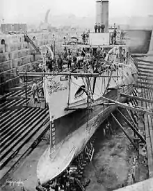 The third HMS Polyphemus was a Royal Navy torpedo ram, serving from 1881 until 1903. A shallow-draft, fast, low-profile vessel, she was designed to penetrate enemy harbours at speed and sink anchored ships.[3] Designed by Nathaniel Barnaby primarily as a protected torpedo boat, the ram was provided very much as secondary armament.[2][4]