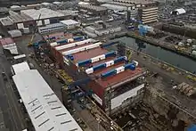 Prince of Wales was assembled at Rosyth from 52 blocks built by six shipyards around the UK. Construction began on 26 May 2011 with the first steel being cut at Govan shipyard by Defence Secretary Liam Fox.[27] In September 2014, Prince of Wales reached a final assembly phase when hull blocks LB02 and LB03 were floated into 1 Dock of Rosyth dockyard, Scotland.[28]