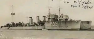 Armament consisted of three QF 4in Mk IV guns on the ship's centreline, with one on the forecastle, one aft on a raised platform and one between the second and third funnels. A single 2-pounder (40 mm) pom-pom anti-aircraft gun was carried, while torpedo armament consisted of two twin rotating mounts for 21 in (533 mm) torpedoes.[2] The ship had a complement of 82 officers and ratings.[3]