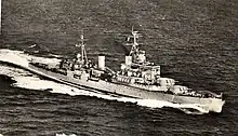 In 1953 she took part in the Fleet Review to celebrate the Coronation of Queen Elizabeth II.[3] On 29 September 1953, she was involved in a collision with the destroyer Diamond leading to a fierce fire in the bridge cable trunk, which carries all the electrical cabling to the bridge, operations room, foremast and DCT. She remained inactive until beginning a major refit in February 1957 at Chatham Dockyard to bring her up largely to the standard of the later Tiger class. Six twin L70 40 mm Bofors would have been fitted[lower-alpha 2]