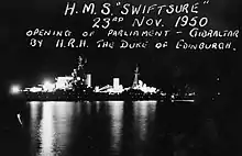 In 1946 she was the flagship of the 4th Cruiser Squadron and in 1951 she became the flagship of the 2nd Cruiser Squadron.[lower-alpha 1] Swiftsure was updated for commonality with HMS Superb with three 'Glasshouse' Directors with Type 275 radar for the 4-inch guns, Type 960M Long Range Air Warning and a more powerful 40 mm light anti-aircraft armament on "Boffin" and "Buster" mountings.