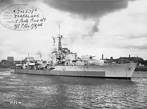 HMS Trafalgar was a Battle-class destroyer of the Royal Navy (RN). She was named after the Battle of Trafalgar, a decisive British victory over a Franco-Spanish Fleet in 1805. Trafalgar was built by Swan Hunter on the Tyne. She was launched on 12 January 1944 and commissioned on 23 July 1945.