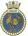 In 1977 Valiant was trailing a Soviet submarine in the eastern Mediterranean when she suffered a salt water pipe leak, which flooded the reactor compartment with sea water. The reactor was shut down and the compartment pumped dry and after a clean-up of the compartment, the reactor was taken under power again.[3] Valiant took part in the Falklands War in 1982, arriving in the war zone on 17 May.[4] She transmitted more than 300 early air-warning alerts and spent 101 days on patrol off Argentina's Patagonian coast. Valiant suffered minor damage while submerged when an Argentine aircraft coming back from a mission jettisoned its bombs near the submarine.[5]