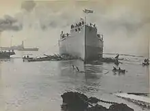 Vanguard, the eighth ship of that name to serve in the Royal Navy,[10] was ordered on 6 February 1908. She was laid down by Vickers Armstrong at their Barrow-in-Furness shipyard on 2 April 1908, launched on 22 February 1909, and completed on 1 March 1910. Including armament, the ship cost about £1.6 million.[Note 2] Vanguard was commissioned on 1 March 1910, under the command of Captain John Eustace,[11] and assigned to the 1st Division of the Home Fleet. She was present in Torbay when King George V visited the fleet in late July. Vanguard also participated in the Coronation Fleet Review at Spithead on 24 June 1911 and she trained with the Atlantic Fleet the following month before beginning a refit.[12] Captain Arthur Ricardo relieved Eustace on 23 September.[13]