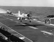Victorious left Australia in September 1945, arrived back in Britain on 27 October and undertook three trips to collect servicemen and war brides of British servicemen from Australia and the Far East.[22] In the winter of 1946–47, the first deck trials with the Hawker Sea Fury (Mark 10) took place aboard Victorious, leading to its approval for carrier operations in early 1947.[23]