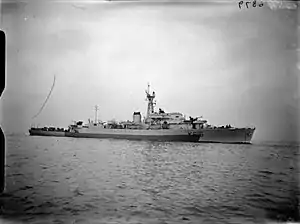 Widemouth Bay was recommissioned in June 1951 for service in 4th Training Flotilla of the Home Fleet, based at Rosyth, also acting as an escort ship, and taking part in the Coronation Naval Review at Spithead in June 1953.[2] The ship was decommissioned again in September 1953 and put into Reserve at Chatham.
