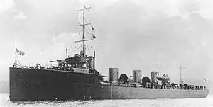 On the outbreak of the First World War the 6th Flotilla formed the basis of the Dover Patrol.[14] Zulu captured the German sailing ship Perhns on 5 August 1914, and collided with sister ship Crusader in both August and September that year.[15] On 24 April 1916, Zulu took place in a large scale operation off the Belgian coast to lay mines and nets, in an attempt to limit use of the ports of Ostend and Zeebrugge to German U-boats. Zulu and Nubian laid lines of dan-buoys to mark to positions for the minefields and nets to be laid.[16] In total, 1,565 mines were laid by the minelayers Princess Margaret, Orvietto, Paris and Biarritz. The minefield probably caused the loss of one U-Boat, UB-13,[17] although at the time it was thought that four or five German submarines had been sunk. The destroyer Melpomene was badly damaged by shellfire from German coast-defence batteries, while one drifter, Clover Bank, was sunk by a mine.[18]