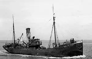 After the war, she stayed briefly in Grimsby, before being sold in February 1946 to Don Trawling Co (Milford) Ltd in Milford Haven. On 20 April 1946 she was in the fishing grounds off the west coast of Ireland during an 85 miles per hour (137 km/h) gale. The gale shifted 140 short tons (130 t) of coal in her bunker, forcing the ship onto her beam ends – so that the deck was near-vertical. The crew spent five and a half hours moving the coal by hand to restore her to an even keel and were eventually forced to put into Berehaven, County Cork.[3][5]