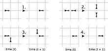 - Each lattice grid cell can only contain a maximum of one particle for each direction, i.e., contain a total of between zero and four particles.