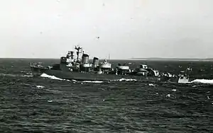 In the early 1960s, Kalmar underwent an extensive rebuild. The front and aft 12 cm guns were replaced with 57 mm m/50 D anti-aircraft guns and the third was removed and replaced by a Bofors 37.5 cm M/50 anti-submarine rocket launcher.[3] In addition, two more m/33 depth charges were added and the mine capacity was increased to 130 mines. Helicopter platform was built and new fire line was installed with a new radar antenna in a radome on the bridge deck. In 1965, the ship was reclassified as a frigate.