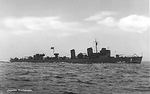 Karlskrona was laid down by Karlskronavarvet in Karlskrona, launched on 16 June 1939 and commissioned on 12 September the following year.[8] The ship was named for the city and allocated the pennant number J8.[9] On 29 June, the destroyer joined the Coastal Fleet, serving on patrols to protect Swedish neutrality and as an escort for convoys travelling through Swedish waters.[10][11]