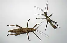 Sporadically, representatives of the subfamily Heteropteryginae can be found, whose spines are different and which also lack individual spines. Philip Edward Bragg found an adult male in Sarawak, which shows the spine arrangement of Haaniella echinata on the pro- and mesonotum, while it shows the spines of H. grayii on the abdomen. This specimens could be a hybrid of both species. It is deposited in Natural History Museum in London. Since the ranges of both species do not overlap, Bragg assumes that they meet at least at their borders. Some authors see the possible hybridization as an indication that these are not two independent species.[3][4]