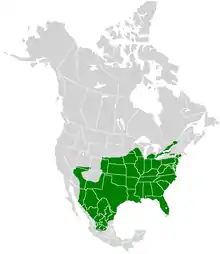 The hackberry emperor is found across a wide range within North America. It has been observed as far south as central Mexico and north into parts of Eastern Canada. Its range extends to the southwest into regions like Arizona, New Mexico, and other parts of the Rockies, as shown by the map. It can commonly be found across the Midwest and especially along the east coast from Florida up to New England.[3][6]