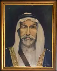 Haditha Ali Abdullah Al-Khraisha (Arabic: حديثه علي عبد الله حميدي خلف سالم حنيف محمد (سليم العود) محمد سليمان حنيف الخريشه) was a Bedouin tribal sheikh in Jordan in the nineteenth and twentieth-centuries. Haditha was one of the two paramount sheikhs of the Bani Sakhr Tribe,[1] arguably the most powerful tribe in Jordan.[2] Haditha headed the northern clans of the Bani Sakher (al-Ka'abnah),[3] while Mithgal Al-Fayez headed the other half, (al-Twaga). In the early twentieth century (1922 & 1924), Haditha and the Bani Sakhr, in addition to other Trans-Jordanian tribes such as the Huweitat and the Belqawiah, fought the Wahhabi Ikhwan, a religious militia who helped establish Abdul Aziz Ibn Saud as the first King of Saudi Arabia. The Wahhabi Ikhwan were Abdul Aziz Ibn Saud's tool for territorial expansion[4] and lent religious legitimacy to Ibn Saud's territorial and political ambitions. According to King Faisal Al Saud the armed resistance that Bani Sakhr put up against Ibn Saud and the Wahhabi Ikhwan was "the reason that Saudi Arabia's borders do not extend all the way to Palestine and why the Al Sauds never became the rulers of the Levant".[5] Haditha was known throughout Arabia for his wisdom and chivalry,[6] He played a significant role in building the nascent Jordanian state and shaping its development.[7] An ally and supporter of King Abdullah I,[8] Haditha served several terms as Senator and Parliamentarian, including the first Jordanian Senate in 1947 which consisted of only ten members.[9] Haditha was also elected to the second Legislative Council in June 1931,[10][11] and the Fourth Legislative Council in 1937[11][12] while Jordan was still an Emirate. Haditha was also one of the founding members of the Jordanian Solidarity Party (Hizb al-Tadamun al-Urduni) in March 1933.[13] Sheikh Haditha also cultivated the oasis of Azraq, Jordan.[14][15]