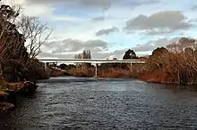 The Minister for Land and Works had approved work on raising it in 1939, but this was postponed indefinitely due to World War II.[86] Raising or renewal of the bridge was again being investigated in 1946.[87] The river again flooded over the bridge in July 1952, the first time since the mid-1940s,[88] and the timber deck was still being repaired into 1953.[89] The last and latest bridge was constructed as part of a bypass of the centre of Hadspen. By 1978, the Bass Highway crossed the river further upstream and the old main road was no longer a through road.[90] This bridge is a 240 metres (790 ft) long two-lane single-carriageway concrete structure.[91]