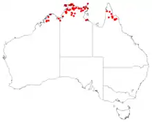 It is found in Western Australia, the Northern Territory and Queensland in the IBRA regions of the Northern Kimberley, Victoria Bonaparte,[2] Arnhem Coast, Darwin Coastal, Northern Kimberley, Pine Creek, Central Arnhem, Tiwi Cobourg, Arnhem Plateau, Gulf Coastal, Daly Basin, the Cape York Peninsula region[9] in open eucalypt forest in dry sandy soils, and also in places that are seasonally flooded.[4]
