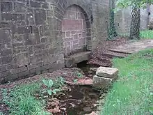 The Hafenlohrquelle (source) of the Hafenlohr river is in the village of Rothenbuch, next to the wall of Rothenbuch Castle (Schloss Rothenbuch). It was set in sandstone when the road ST2317 was broadened.