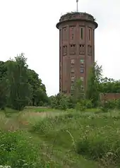 As a starting point of the first railway line towards Mecklenburg-Schwerin Hagenow Land station was equipped with the standard equipment for the maintenance and repair of railway rollingstock. These still exists, but in a highly dilapidated condition. There was a depot (Bahnbetriebswerk), which was located on the south side of the line towards Ludwigslust. It had among other things, a roundhouse with ten stalls and a turntable. Another very similar building nearby suggests a second roundhouse, but all traces of a turntable and sidings that probably once existed have disappeared. There are other sidings and a shed on the property. A former water tower, which is about 30 m-high, is located near the station building. This eleven-storey high, Brick Expressionist construction was built in 1926.[8] It is in a highly dilapidated condition and is a heritage-listed building.[9]