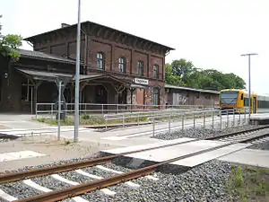 Hagenow Stadt station is a station the German state of Mecklenburg-Vorpommern on the Hagenow Land–Bad Oldesloe railway, which is now largely disused or dismantled to the northwest of the station. It is located in the centre of Hagenow and was built in 1894[2] with the name of Hagenow, but it has been listed in the official timetables as Hagenow Stadt (town) since 2010. It consists of a small entrance building with catering facilities and, attached on its southern side, there is a long shed that used to serve freight operations. The main platform and another island platform are located on the two-track line. The entrance building is on the side of the line that faces towards the centre of town. Between Hagenow Stadt station and the point where the line towards Hagenow Land station becomes a single track, the tracks spread at two locations with four or five parallel sidings at each place, but they are no longer used. The entrance building and the freight terminal buildings are heritage-listed monuments.[3]