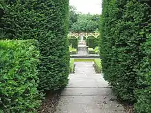 While developing the gardens and landscaping at Haggeston, Christopher Leyland was sent by his brother John, six Cupressocyparis × leylandii, a hybrid tree that was the result of spontaneous cross-pollination at Leighton Hall in 1888 when the female flowers or cones of Nootka cypress (Cupressus nootkatensis) were fertilised by pollen from Monterey cypress (Cupressus macrocarpa).[5] In 1925 a firm of commercial nurserymen specialising in conifers were looking for a particular breed; one that was fast growing and could be deployed in hard-to-grow windy and salty areas such as Cornwall. Eventually they found the six original trees developed by Leyland and began propagating the species, calling them "Haggerston Grey" in respect to their origins.[6] In 1953 a freak tornado blew down one of the original trees; subsequently the Forestry Commission started developing hybrids from the five survivors. Commercial nurseries spotted the potential of the now termed "Leylandii", and it is one of the biggest-selling items in garden centres in Great Britain.[7]