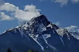 Hagwilget Peak is the northernmost mountain in the Rocher Déboulé Range in northern British Columbia, Canada. The 2,076-metre (6,811-foot) mountain summit is conspicuously situated immediately south of Hazelton, British Columbia. Overlooking New Hazelton, it rises 1,770 m (5,807 ft) above the surrounding valley. Precipitation runoff from the mountain drains into the Skeena River and Bulkley River. Based on the Köppen climate classification, Hagwilget Peak is located in a subarctic climate zone with cold, snowy winters, and mild summers.[3] Temperatures can drop below −20 °C with wind chill factors below −30 °C. Originally labelled Nil-ke-auda on George Dawson's map for an 1879–80 report for the Geological Survey of Canada, it was later adopted as Awillgate Peak in 1917. The spelling changed to Hagwilget Peak on 1 February 1963, when officially adopted by the Geographical Names Board of Canada to conform with the modern spelling of the namesake village, Hagwilget.[4][2]