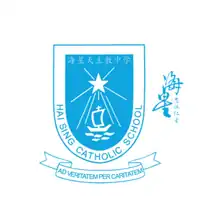 The current school crest is a shining star with a boat underneath it, to represent the school as the "Star of the Sea". A banner contains the Latin words, Ad Veritatem Per Caritatem (To truth (God) through charity) below the logo. The school crest was created in 1959 under the name, Hai Sing Girls' School. After they changed their policy to accept boys and students of other races in 1990, the school crest was redesigned under the name Hai Sing Catholic School in 1992 after changing it from Hai Sing High School.[17]
